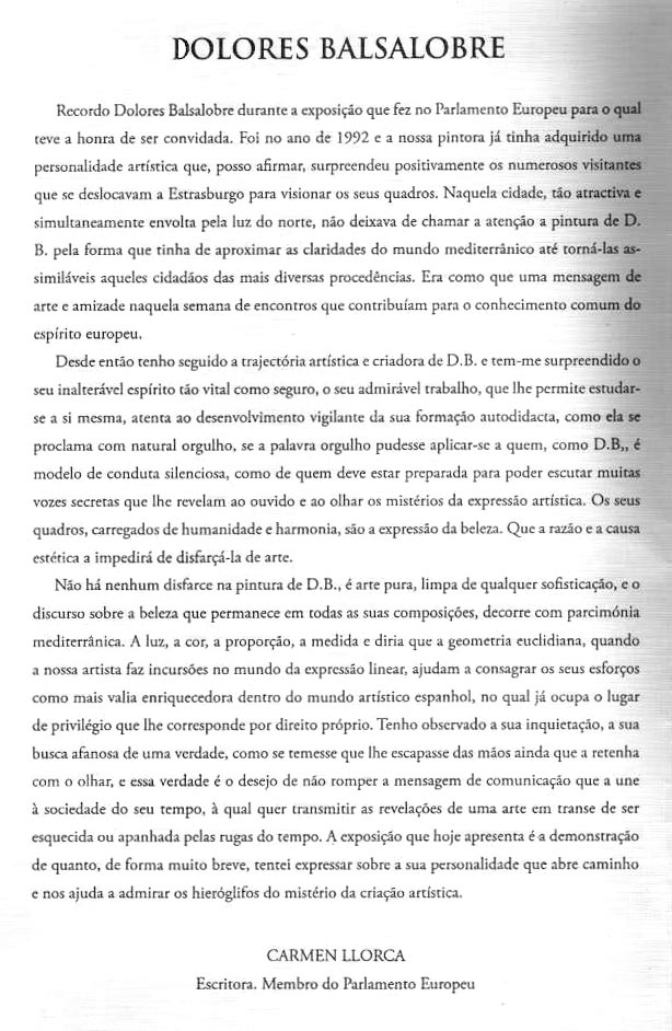 Llorca Vilaplana, Carmen. “Dolores Balsalobre” catálogo exp.“Homenagem a Mulher” galería Belobelo, mayo 2005 Braga, Portugal